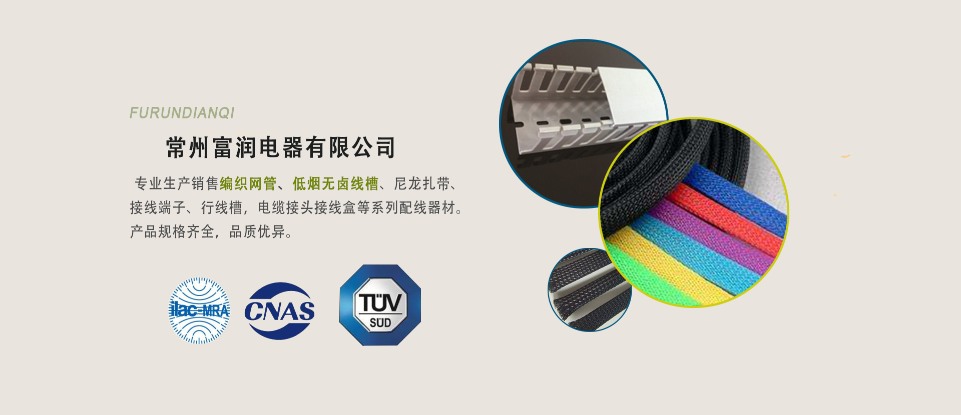 常州富潤電器有限公司專業(yè)生產(chǎn)、銷售編織網(wǎng)管、尼龍?jiān)鷰?、接線端子、行線槽,電纜接頭接線盒等系列配線器材···